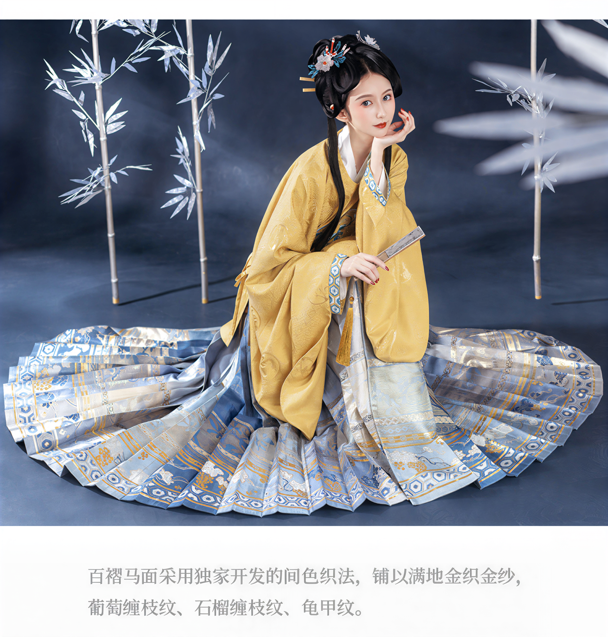 Ming Dynasty Hanfu | Autumn Fragrance Yellow Round Neck Shirt + Gradient Blue Horse Face Skirt: Elegant Chinese Style Set